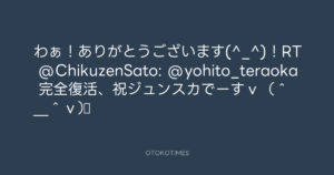 寺岡呼人 @yohito_teraoka – 11:22・2011年10月1日 2011 10/01 寺岡呼人 2011-10-01 わぁ!ありがとうございます(^_^)!RT @ChikuzenSato: @yohito_teraoka 完全復活、祝ジュンスカでーすv(^_^v)♪ Source:https://x.com/yohito_teraoka/status/11996044432... text X Post 寺岡呼人 寺岡呼人 この記事が気に入ったら フォローしてね! Follow @OtokoTimes1988 よかったらシェアしてね! URLをコピーしました! 寺岡呼人 @yohito_teraoka - 11:22・2011年10月1日 寺岡呼人 @yohito_teraoka - 11:27・2011年10月1日 関連記事 Artist 寺岡呼人 1968.02.07