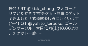 是非!RT @kick_chang: フォローさせていただきます♪チケット無事にゲットできました!武道館楽しみにしています(^-^) QT @yohito_teraoka: ゴールデンサークル、本日10/1(土)10:00より、チケット一般発売となります。