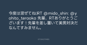 寺岡呼人 @yohito_teraoka – 17:35・2011年10月5日 2011 10/05 寺岡呼人 2011-10-05 今度は混ぜてね♫RT @mido_shin: @yohito_teraoka 先輩、RTありがとうございます!先輩を差し置いて美男対決だなんてすみません。 Source:https://x.com/yohito_teraoka/status/12150375742... text X Post 寺岡呼人 寺岡呼人 この記事が気に入ったら フォローしてね! Follow @OtokoTimes1988 よかったらシェアしてね! URLをコピーしました! 寺岡呼人 @yohito_teraoka - 14:58・2011年10月5日 青山英樹 @aoyama_hideki - 22:09・2011年10月5日 関連記事 Artist 寺岡呼人 1968.02.07