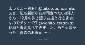 まってまーす♫RT @aikotobahasmile: あぁ、私も新鮮なお寿司食べたい!!呼人さん、12月の弾き語り友達と行きます♪なのでチケ〜 RT @yohito_teraoka: 林君と寿司食べてきました。めちゃ旨かった!青森のお寿司最高!