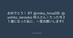 寺岡呼人 @yohito_teraoka – 0:09・2011年10月8日 2011 10/08 寺岡呼人 2011-10-08 おめでとう! RT @mika_hiros08: @yohito_teraoka 呼人さん!たった今21歳になった私に、一言お願いします!! Source:https://x.com/yohito_teraoka/status/12232776723... text X Post 寺岡呼人 寺岡呼人 この記事が気に入ったら フォローしてね! Follow @OtokoTimes1988 よかったらシェアしてね! URLをコピーしました! 寺岡呼人 @yohito_teraoka - 23:58・2011年10月7日 寺岡呼人 @yohito_teraoka - 0:20・2011年10月8日 関連記事 Artist 寺岡呼人 1968.02.07