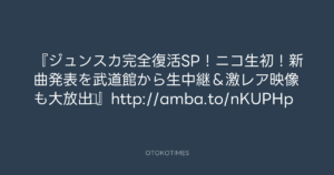 寺岡呼人 @yohito_teraoka – 15:16・2011年10月11日 2011 10/11 寺岡呼人 2011-10-11 『ジュンスカ完全復活SP!ニコ生初!新曲発表を武道館から生中継&激レア映像も大放出♪』http://amba.to/nKUPHp Source:https://x.com/yohito_teraoka/status/12364313256... text X Post 寺岡呼人 寺岡呼人 この記事が気に入ったら フォローしてね! Follow @OtokoTimes1988 よかったらシェアしてね! URLをコピーしました! 青山英樹 @aoyama_hideki - 10:45・2011年10月11日 寺岡呼人 @yohito_teraoka - 15:17・2011年10月11日 関連記事 Artist 寺岡呼人 1968.02.07