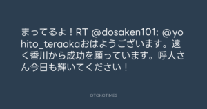 寺岡呼人 @yohito_teraoka – 13:09・2011年10月25日 2011 10/25 寺岡呼人 2011-10-25 まってるよ!RT @dosaken101: @yohito_teraokaおはようございます。遠く香川から成功を願っています。呼人さん今日も輝いてください! Source:https://x.com/yohito_teraoka/status/12868463842... text X Post 寺岡呼人 寺岡呼人 この記事が気に入ったら フォローしてね! Follow @OtokoTimes1988 よかったらシェアしてね! URLをコピーしました! Koyo Maeda @koyomaeda - 12:41・2011年10月25日 寺岡呼人 @yohito_teraoka - 13:28・2011年10月25日 関連記事 Artist 寺岡呼人 1968.02.07