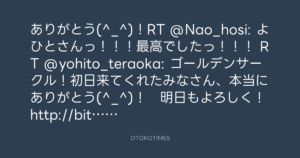 ありがとう(^_^)!RT @Nao_hosi: よひとさんっ!!!最高でしたっ!!! RT @yohito_teraoka: ゴールデンサークル!初日来てくれたみなさん、本当にありがとう(^_^)! 明日もよろしく! http://bit.ly/uYJ7HU