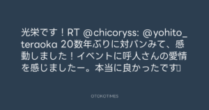 寺岡呼人 @yohito_teraoka – 1:17・2011年10月26日 2011 10/26 寺岡呼人 2011-10-26 光栄です!RT @chicoryss: @yohito_teraoka 20数年ぶりに対バンみて、感動しました!イベントに呼人さんの愛情を感じましたー。本当に良かったです★ Source:https://x.com/yohito_teraoka/status/12886783911... text X Post 寺岡呼人 寺岡呼人 この記事が気に入ったら フォローしてね! Follow @OtokoTimes1988 よかったらシェアしてね! URLをコピーしました! 寺岡呼人 @yohito_teraoka - 0:52・2011年10月26日 寺岡呼人 @yohito_teraoka - 1:23・2011年10月26日 関連記事 Artist 寺岡呼人 1968.02.07