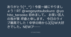 ありがとう(^_^)!今度一緒にやりましょう!RT @wagayatsubokura: @yohito_teraoka 初めまして。 お笑い芸人の我が家 坪倉と申します。 今日のライブ最高でした!中学の時からJ(S)W大好きでした。NEWアルバム楽しみにしてます!