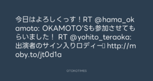 寺岡呼人 @yohito_teraoka – 17:05・2011年10月26日 2011 10/26 寺岡呼人 2011-10-26 今日はよろしくっす!RT @hama_okamoto: OKAMOTO’Sも参加させてもらいました! RT @yohito_teraoka: 出演者のサイン入りロディー♫ http://moby.to/jt0d1a Source:https://x.com/yohito_teraoka/status/12910629818... text X Post 寺岡呼人 寺岡呼人 この記事が気に入ったら フォローしてね! Follow @OtokoTimes1988 よかったらシェアしてね! URLをコピーしました! 寺岡呼人 @yohito_teraoka - 16:46・2011年10月26日 Koyo Maeda @koyomaeda - 17:10・2011年10月26日 関連記事 Artist 寺岡呼人 1968.02.07