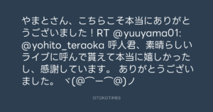 やまとさん、こちらこそ本当にありがとうございました!RT @yuuyama01: @yohito_teraoka 呼人君、素晴らしいライブに呼んで貰えて本当に嬉しかったし、感謝しています。 ありがとうございました。 ヾ(@⌒ー⌒@)ノ