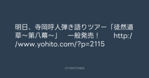 寺岡呼人 @yohito_teraoka – 14:20・2011年11月2日 2011 11/02 寺岡呼人 2011-11-02 明日、寺岡呼人弾き語りツアー「徒然道草〜第八幕〜」 一般発売! http://www.yohito.com/?p=2115 Source:https://x.com/yohito_teraoka/status/13160160751... text X Post 寺岡呼人 寺岡呼人 この記事が気に入ったら フォローしてね! Follow @OtokoTimes1988 よかったらシェアしてね! URLをコピーしました! 青山英樹 @aoyama_hideki - 13:20・2011年11月2日 青山英樹 @aoyama_hideki - 21:44・2011年11月2日 関連記事 Artist 寺岡呼人 1968.02.07