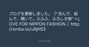 寺岡呼人 @yohito_teraoka – 10:43・2011年11月7日 2011 11/07 寺岡呼人 2011-11-07 ブログを更新しました。『“包んで、結んで、開いて。ふふふ、ふろしき祭”×LOVE FOR NIPPON FASHION 』http://amba.to/uRjHS3 Source:https://x.com/yohito_teraoka/status/13335879513... text X Post 寺岡呼人 寺岡呼人 この記事が気に入ったら フォローしてね! Follow @OtokoTimes1988 よかったらシェアしてね! URLをコピーしました! 青山英樹 @aoyama_hideki - 21:19・2011年11月6日 青山英樹 @aoyama_hideki - 10:54・2011年11月7日 関連記事 Artist 寺岡呼人 1968.02.07