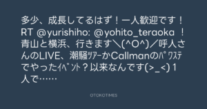 多少、成長してるはず!一人歓迎です!RT @yurishiho: @yohito_teraoka !青山と横浜、行きます\(^O^)/呼人さんのLIVE、潮騒ツアーかCallmanのパワステでやったイベント?以来なんです(>_<)1人で参加でドキドキですが楽しみにしていま
