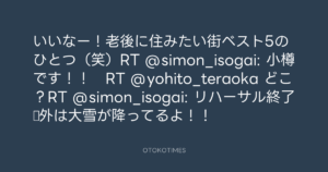 寺岡呼人 @yohito_teraoka – 16:36・2011年12月10日 2011 12/10 寺岡呼人 2011-12-10 いいなー!老後に住みたい街ベスト5のひとつ(笑)RT @simon_isogai: 小樽です!! RT @yohito_teraoka どこ?RT @simon_isogai: リハーサル終了☆外は大雪が降ってるよ!! Source:https://x.com/yohito_teraoka/status/14540656383... text X Post 寺岡呼人 寺岡呼人 この記事が気に入ったら フォローしてね! Follow @OtokoTimes1988 よかったらシェアしてね! URLをコピーしました! 寺岡呼人 @yohito_teraoka - 16:32・2011年12月10日 寺岡呼人 @yohito_teraoka - 16:40・2011年12月10日 関連記事 Artist 寺岡呼人 1968.02.07
