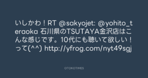 寺岡呼人 @yohito_teraoka – 18:41・2011年12月21日 2011 12/21 寺岡呼人 2011-12-21 いしかわ!RT @sakyojet: @yohito_teraoka 石川県のTSUTAYA金沢店はこんな感じです。10代にも聴いて欲しい!って(^^) http://yfrog.com/nyt49sgj Source:https://x.com/yohito_teraoka/status/14942435788... text X Post 寺岡呼人 寺岡呼人 この記事が気に入ったら フォローしてね! Follow @OtokoTimes1988 よかったらシェアしてね! URLをコピーしました! 寺岡呼人 @yohito_teraoka - 18:41・2011年12月21日 寺岡呼人 @yohito_teraoka - 18:42・2011年12月21日 関連記事 Artist 寺岡呼人 1968.02.07