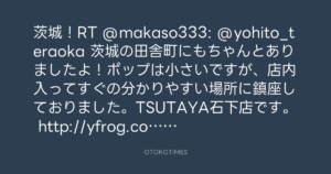 茨城!RT @makaso333: @yohito_teraoka 茨城の田舎町にもちゃんとありましたよ!ポップは小さいですが、店内入ってすぐの分かりやすい場所に鎮座しておりました。TSUTAYA石下店です。 http://yfrog.com/odscqp