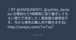 !RT @MASUN0511: @yohito_teraoka 仕事終わり1時間前に取り置きしてもらい借りて来ました!長崎県の諫早店です。今から帰宅の車ん中で聴きますね♪ http://twitpic.com/7w7xq7