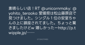 素晴らしい店!RT @unicornmaky: @yohito_teraoka 愛媛県は松山藤原店で見つけました。シングル1位の安室ちゃんの上に鎮座されてました。ちょっと驚きましたけどw 嬉しかったーhttp://p.twipple.jp/ybr76
