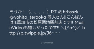 そうか!(、、、、)RT @hrhsszk: @yohito_teraoka 呼人さん!!こんばんは!!☆草加市の松原団地駅前店です!! MusicVideoも嬉しかったです!! \(^o^)/ http://p.twipple.jp/J6rLL