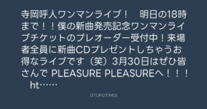 寺岡呼人ワンマンライブ! 明日の18時まで!!僕の新曲発売記念ワンマンライブチケットのプレオーダー受付中!来場者全員に新曲CDプレゼントしちゃうお得なライブです(笑)3月30日はぜひ皆さんで