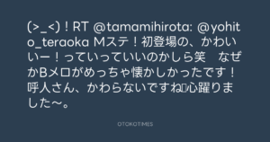 寺岡呼人 @yohito_teraoka – 22:20・2012年1月20日 2012 1/20 寺岡呼人 2012-01-20 (>_<)!RT @tamamihirota: @yohito_teraoka Mステ!初登場の、かわいいー!っていっていいのかしら笑 なぜかBメロがめっちゃ懐かしかったです!呼人さん、かわらないですね☆心躍りました~。 Source:https://x.com/yohito_teraoka/status/16035099622... text X Post 寺岡呼人 寺岡呼人 この記事が気に入ったら フォローしてね! Follow @OtokoTimes1988 よかったらシェアしてね! URLをコピーしました! 寺岡呼人 @yohito_teraoka - 18:57・2012年1月20日 寺岡呼人 @yohito_teraoka - 23:06・2012年1月20日 関連記事 Artist 寺岡呼人 1968.02.07
