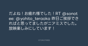 寺岡呼人 @yohito_teraoka – 12:48・2012年1月30日 2012 1/30 寺岡呼人 2012-01-30 だよね!お疲れ様でした!RT @sonotee: @yohito_teraoka 昨日ご挨拶できればと思ってましたがニアミスでした。放映楽しみにしています! Source:https://x.com/yohito_teraoka/status/16383097457... text X Post 寺岡呼人 寺岡呼人 この記事が気に入ったら フォローしてね! Follow @OtokoTimes1988 よかったらシェアしてね! URLをコピーしました! 寺岡呼人 @yohito_teraoka - 12:48・2012年1月30日 Koyo Maeda @koyomaeda - 15:03・2012年1月30日 関連記事 Artist 寺岡呼人 1968.02.07