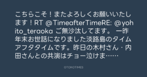 こちらこそ!またよろしくお願いいたします!RT @TimeafterTimeRE: @yohito_teraoka ご無沙汰してます。 一昨年末お世話になりました淡路島のタイムアフタタイムです。昨日の木村さん・内田さんとの共演はチョー泣けました!!また淡路島にもいらして下さい。