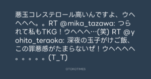 悪玉コレステロール高いんですよ、ウヘヘヘヘ。。RT @mika_tazawa: つられて私もTKG!ウヘヘヘ…(笑) RT @yohito_teraoka: 深夜の玉子がけご飯、この罪悪感がたまらないぜ!ウヘヘヘヘ。。。。。(T_T)