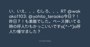 寺岡呼人 @yohito_teraoka – 1:07・2012年2月19日 2012 2/19 寺岡呼人 2012-02-19 い、いえ、、、むしろ、、、RT @wakako1103: @yohito_teraoka今日?!昨日?!も素敵でした。ベース弾いてる時の呼人サンもかっこいいですo(^-^)o呼人サン痩せました? Source:https://x.com/yohito_teraoka/status/17090216079... text X Post 寺岡呼人 寺岡呼人 この記事が気に入ったら フォローしてね! Follow @OtokoTimes1988 よかったらシェアしてね! URLをコピーしました! Koyo Maeda @koyomaeda - 22:32・2012年2月18日 寺岡呼人 @yohito_teraoka - 1:18・2012年2月19日 関連記事 Artist 寺岡呼人 1968.02.07