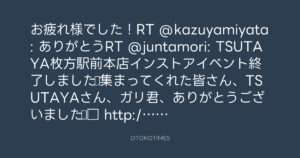 お疲れ様でした!RT @kazuyamiyata: ありがとうRT @juntamori: TSUTAYA枚方駅前本店インストアイベント終了しました☆集まってくれた皆さん、TSUTAYAさん、ガリ君、ありがとうございました☆□ http://twitpic.com/8ox5mc