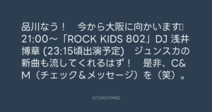 寺岡呼人 @yohito_teraoka – 18:09・2012年3月12日 2012 3/12 寺岡呼人 2012-03-12 品川なう! 今から大阪に向かいます♫ 21:00〜「ROCK KIDS 802」DJ 浅井博章 (23:15頃出演予定) ジュンスカの新曲も流してくれるはず! 是非、C&M(チェック&メッセージ)を(笑)。 Source:https://x.com/yohito_teraoka/status/17913207785... text X Post 寺岡呼人 寺岡呼人 この記事が気に入ったら フォローしてね! Follow @OtokoTimes1988 よかったらシェアしてね! URLをコピーしました! 青山英樹 @aoyama_hideki - 16:34・2012年3月12日 寺岡呼人 @yohito_teraoka - 18:51・2012年3月12日 関連記事 Artist 寺岡呼人 1968.02.07