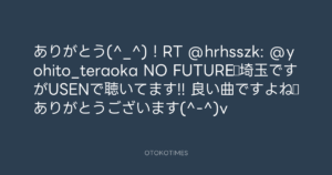 ありがとう(^_^)!RT @hrhsszk: @yohito_teraoka NO FUTURE♪埼玉ですがUSENで聴いてます!! 良い曲ですよね☆ありがとうございます(^-^)v