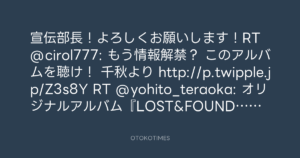 宣伝部長!よろしくお願いします!RT @cirol777: もう情報解禁? このアルバムを聴け! 千秋より http://p.twipple.jp/Z3s8Y RT @yohito_teraoka: オリジナルアルバム『LOST&FOUND』2012年4月25日リリース決定!