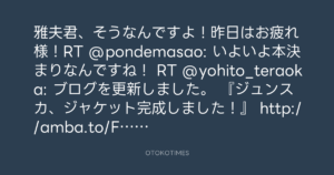 雅夫君、そうなんですよ!昨日はお疲れ様!RT @pondemasao: いよいよ本決まりなんですね! RT @yohito_teraoka: ブログを更新しました。 『ジュンスカ、ジャケット完成しました!』 http://amba.to/FOTeTJ