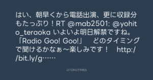 はい、朝早くから電話出演、更に収録分もたっぷり!RT @mab2501: @yohito_teraoka いよいよ明日解禁ですね。「Radio Goo! Goo!」 どのタイミングで聞けるかなぁ~楽しみです! http://bit.ly/gWFpdL