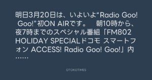 明日3月20日は、いよいよ“Radio Goo! Goo!”初ON AIRです。 朝10時から、夜7時までのスペシャル番組「FM802 HOLIDAY SPECIALドコモ スマートフォン ACCESS! Radio Goo! Goo!」内です。僕、出まくります(笑)!