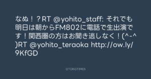 寺岡呼人 @yohito_teraoka – 2:25・2012年3月20日 2012 3/20 寺岡呼人 2012-03-20 なぬ!?RT @yohito_staff: それでも明日は朝からFM802に電話で生出演です!関西圏の方はお聞き逃しなく!(^-^)RT @yohito_teraoka http://ow.ly/9KfGD Source:https://x.com/yohito_teraoka/status/18179341139... text X Post 寺岡呼人 寺岡呼人 この記事が気に入ったら フォローしてね! Follow @OtokoTimes1988 よかったらシェアしてね! URLをコピーしました! 寺岡呼人 @yohito_teraoka - 2:24・2012年3月20日 寺岡呼人 @yohito_teraoka - 2:26・2012年3月20日 関連記事 Artist 寺岡呼人 1968.02.07
