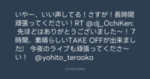 いやー、いい声してる!さすが!長時間頑張ってください!RT @dj_OchiKen: 先ほどはありがとうございました〜!7時間、素晴らしいTAKE OFFが出来ました♪ 今夜のライブも頑張ってくださ〜い! @yohito_teraoka