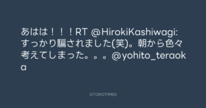あはは!!!RT @HirokiKashiwagi: すっかり騙されました(笑)。朝から色々考えてしまった。。。@yohito_teraoka