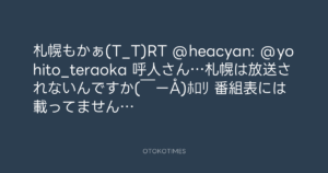 寺岡呼人 @yohito_teraoka – 23:53・2012年4月9日 2012 4/09 寺岡呼人 2012-04-09 札幌もかぁ(T_T)RT @heacyan: @yohito_teraoka 呼人さん…札幌は放送されないんですか( ̄ーÅ)ホロリ 番組表には載ってません… Source:https://x.com/yohito_teraoka/status/18936544798... text X Post 寺岡呼人 寺岡呼人 この記事が気に入ったら フォローしてね! Follow @OtokoTimes1988 よかったらシェアしてね! URLをコピーしました! 寺岡呼人 @yohito_teraoka - 23:52・2012年4月9日 寺岡呼人 @yohito_teraoka - 0:02・2012年4月10日 関連記事 Artist 寺岡呼人 1968.02.07