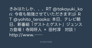 きみはたしか、、、RT @takayuki_kori: 今夜も勉強させていただきます☆彡 RT @yohito_teraoka: 本日、テレビ朝日、新番組「ゲストとゲスト」ジュンスカ登場!寺岡呼人 × 田村淳 対談! http://www.tv-asahi.co.jp/guestguest/