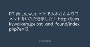寺岡呼人 @yohito_teraoka – 1:09・2012年4月12日 2012 4/12 寺岡呼人 2012-04-12 RT @j_s_w_s: ビビる大木さんよりコメントをいただきました! http://junskywalkers.jp/lost_and_found/index.php?e=12 Source:https://x.com/yohito_teraoka/status/19010936718... text X Post 寺岡呼人 寺岡呼人 この記事が気に入ったら フォローしてね! Follow @OtokoTimes1988 よかったらシェアしてね! URLをコピーしました! 寺岡呼人 @yohito_teraoka - 1:08・2012年4月12日 青山英樹 @aoyama_hideki - 4:32・2012年4月12日 関連記事 Artist 寺岡呼人 1968.02.07