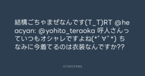寺岡呼人 @yohito_teraoka – 16:28・2012年4月16日 2012 4/16 寺岡呼人 2012-04-16 結構ごちゃまぜなんです(T_T)RT @heacyan: @yohito_teraoka 呼人さんっていつもオシャレですよね(*゚∀゚*) ちなみに今着てるのは衣装なんですか?? Source:https://x.com/yohito_teraoka/status/19179012916... text X Post 寺岡呼人 寺岡呼人 この記事が気に入ったら フォローしてね! Follow @OtokoTimes1988 よかったらシェアしてね! URLをコピーしました! Koyo Maeda @koyomaeda - 15:26・2012年4月16日 寺岡呼人 @yohito_teraoka - 16:29・2012年4月16日 関連記事 Artist 寺岡呼人 1968.02.07