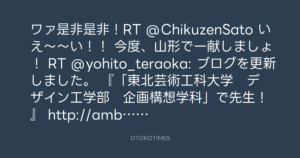 ワァ是非是非!RT @ChikuzenSato いえ〜〜い!! 今度、山形で一献しましょ! RT @yohito_teraoka: ブログを更新しました。 『「東北芸術工科大学 デザイン工学部 企画構想学科」で先生!』 http://amba.to/HUze0v