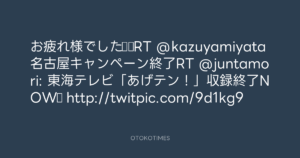 お疲れ様でした☆☆RT @kazuyamiyata 名古屋キャンペーン終了RT @juntamori: 東海テレビ「あげテン!」収録終了NOW☆ http://twitpic.com/9d1kg9