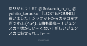 ありがとう!RT @Sakura5_n_n_ @yohito_teraoka 『LOST&FOUND』買いました!ジャケットからカッコ良すぎですd=(^o^)=b曲も最高~!ジュンスカ=懐かしい…くない!新しいジュンスカに魅せられ… http://tl.gd/h4qs0j
