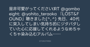 是非可愛がってください☆RT @gambaeight: @yohito_teraoka 「LOST&FOUND」聴きました(^。^) 先日、40代に突入してしまい気持ち的にジタバタしていた心に応援してくれるようなめちゃくちゃ染み込むアルバムでした!ありがとう(^。^)