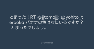 寺岡呼人 @yohito_teraoka – 0:44・2012年4月30日 2012 4/30 寺岡呼人 2012-04-30 とまった!RT @jjtomojjj: @yohito_teraoka バナナの色はなにいろですか? とまったでしょう。 Source:https://x.com/yohito_teraoka/status/19662613510... text X Post 寺岡呼人 寺岡呼人 この記事が気に入ったら フォローしてね! Follow @OtokoTimes1988 よかったらシェアしてね! URLをコピーしました! 青山英樹 @aoyama_hideki - 23:55・2012年4月29日 寺岡呼人 @yohito_teraoka - 1:13・2012年4月30日 関連記事 Artist 寺岡呼人 1968.02.07
