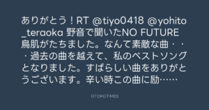 ありがとう!RT @tiyo0418 @yohito_teraoka 野音で聞いたNO FUTURE 鳥肌がたちました。なんて素敵な曲・・・過去の曲を越えて、私のベストソングとなりました。すばらしい曲をありがとうございます。辛い時この曲に励まされそうです☆
