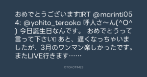 おめでとうございます☆RT @marinti054: @yohito_teraoka 呼人さ~ん(^O^) 今日誕生日なんです。 おめでとうって言って下さい♪ あと、遅くなっちゃいましたが、3月のワンマン楽しかったです。またLIVE行きます!!