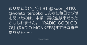 ありがとう(^_^)!RT @kaori_4110: @yohito_teraoka こんなに毎日ラジオを聞いたのは、中学・高校生以来だったかもしれません。「RADIO GOO! GOO!」(RADIO MONKEES)すてきな春をありがとうございました♪