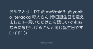 寺岡呼人 @yohito_teraoka – 8:50・2012年5月11日 2012 5/11 寺岡呼人 2012-05-11 おめでとう!RT @me9mi69: @yohito_teraoka 呼人さん!!今日誕生日を迎えました!!一言いただけたら嬉しいです♪ちなみに泉谷しげるさんと同じ誕生日です♪ヽ(´▽`)/ Source:https://x.com/yohito_teraoka/status/20073469241... text X Post 寺岡呼人 寺岡呼人 この記事が気に入ったら フォローしてね! Follow @OtokoTimes1988 よかったらシェアしてね! URLをコピーしました! 青山英樹 @aoyama_hideki - 2:13・2012年5月11日 寺岡呼人 @yohito_teraoka - 8:51・2012年5月11日 関連記事 Artist 寺岡呼人 1968.02.07